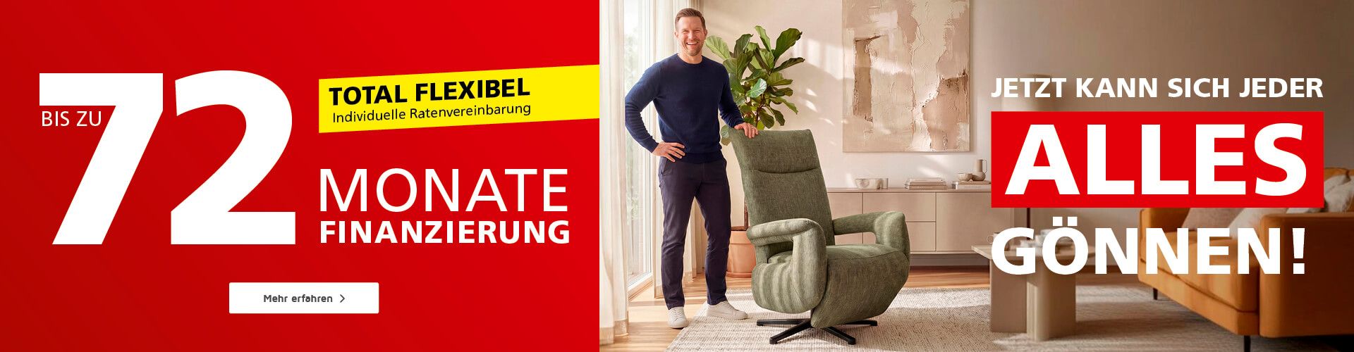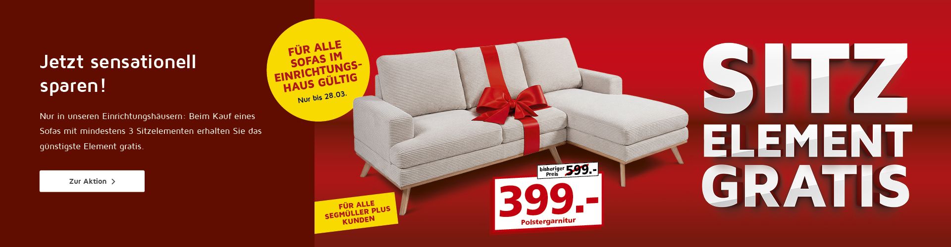 3,90 % effektiver Jahreszins bis zu 12 Monate für SEGMÜLLER PLUS-Kunden für einen Möbelkauf im Einrichtungshaus (nicht bei Kauf in unserem Onlineshop) ab einem Auftragswert von 120.- €, ohne Anzahlung. Beispiel: Finanzierungsbetrag 120.- € = 12 Raten zu je 10,21 €. Finanzierung durch Openbank Pay (Open Bank, S.A.). Nettodarlehensbetrag entspricht dem Kaufpreis. Effektiver Jahreszins und gebundener Sollzinssatz beträgt 3,90 % p.a., bei längeren Laufzeiten 4,90 % bis 7,9 % p.a., Bonität vorausgesetzt. Hierbei handelt es sich um ein Angebot der Open Bank, S.A., mit Geschäftsadresse Plaza de Santa Bárbara Nr. 2, 28004 Madrid, Spanien. Die Open Bank S.A. ist eine hundertprozentige Tochtergesellschaft der Banco Santander S.A. Die Angaben stellen zugleich das 2/3-Beispiel gemäß § 17 Abs. 4 PAngV dar.