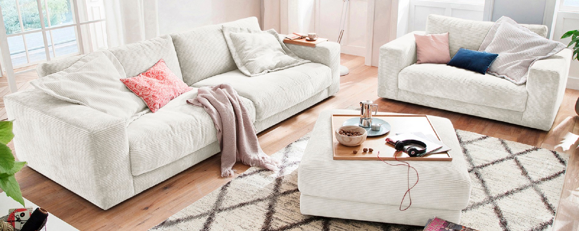 Bezüge von Stoffsofas bestehen aus einem Flachgewebe, das durch eine angenehme Haptik sowie durch hochwertige Optik überzeugt. Meist werden die Stoffe der Sofas aus zwei Fadengruppen hergestellt, die sich rechtwinklig überkreuzen. Zu beliebten Megasofa-Modellen gehören unter anderem auch Bigsofas aus Cord.