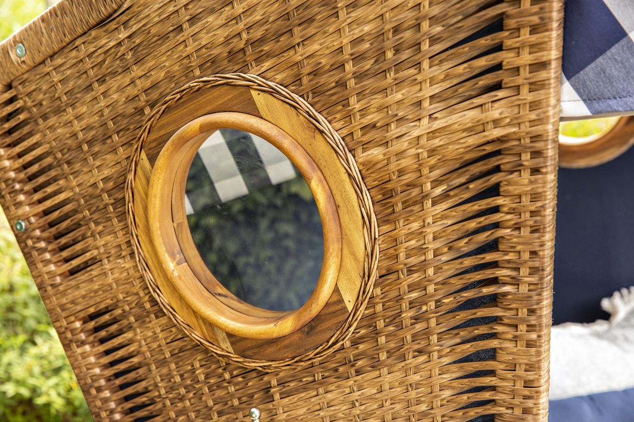Einige Strandkörbe sind mit Bullaugen aus Aluminium, Holz oder Edelstahl ausgestattet. Diese kleinen Fenster verleihen dem Strandkorb nicht nur einen charmanten maritimen Look, sondern ermöglichen auch einen seitlichen Blick nach draußen.