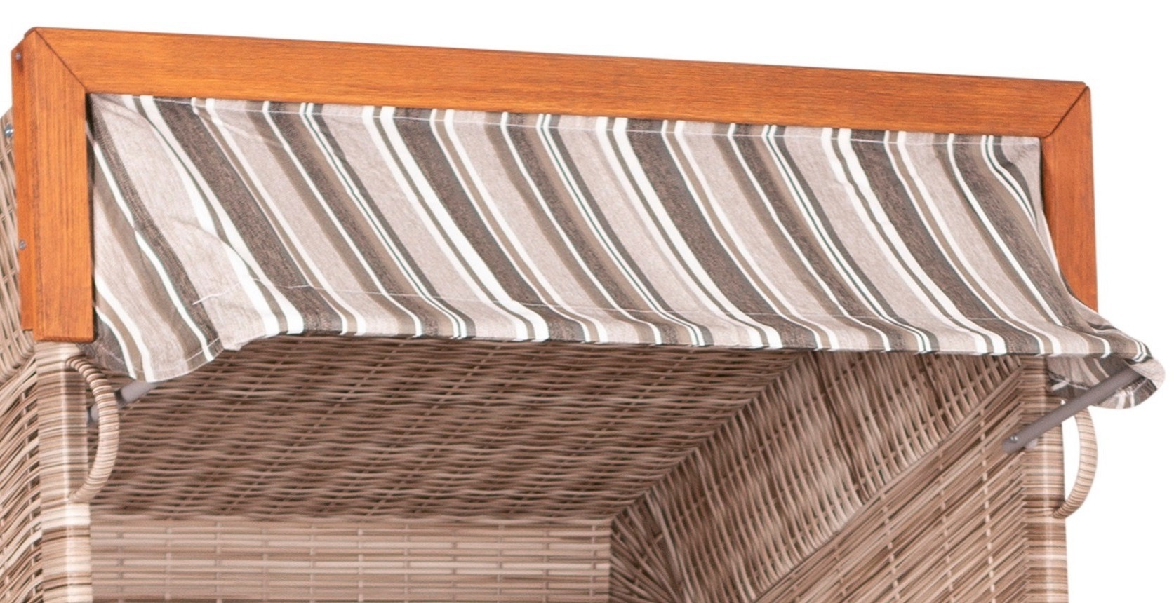 Markisen und Polsterungen aus Polyester sind aufgrund ihrer robusten Eigenschaften eine beliebte Wahl für Strandkörbe. Polyester ist bekannt für seine Reißfestigkeit und Strapazierfähigkeit – es hält den täglichen Beanspruchungen im Freien problemlos stand. Es ist widerstandsfähig gegenüber Verfärbungen und Verwitterung durch UV-Strahlen. Olefin (synthetische Fasern auf Basis von Polyethylen oder Polypropylen) ist ein weiteres beliebtes Material für Markisen und Polsterungen von Strandkörben. Es ist beständig gegen Verschleiß, Flecken und Feuchtigkeit. Das Material behält seine Form und Farbe über eine lange Zeit hinweg, selbst bei regelmäßiger Nutzung im Freien.