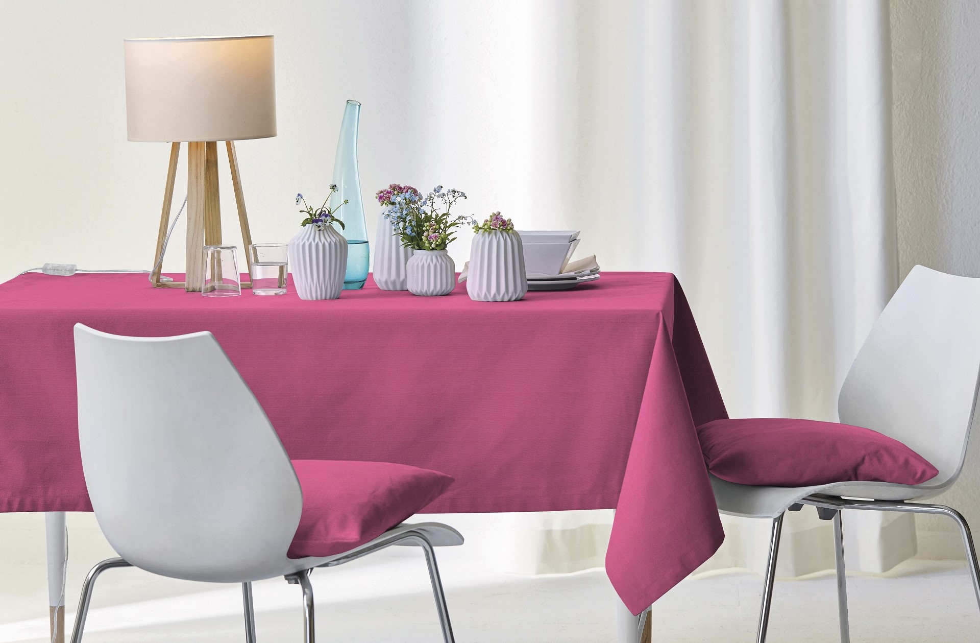 Modern und geradlinig: Für ein modernes Esszimmer wählen Sie eine unifarbene Tischdecke in knalligem Orange oder zartem Rosé. Ein besonderer Hingucker ist eine weiße Tischdecke mit einem einfarbigen Tischläufer.