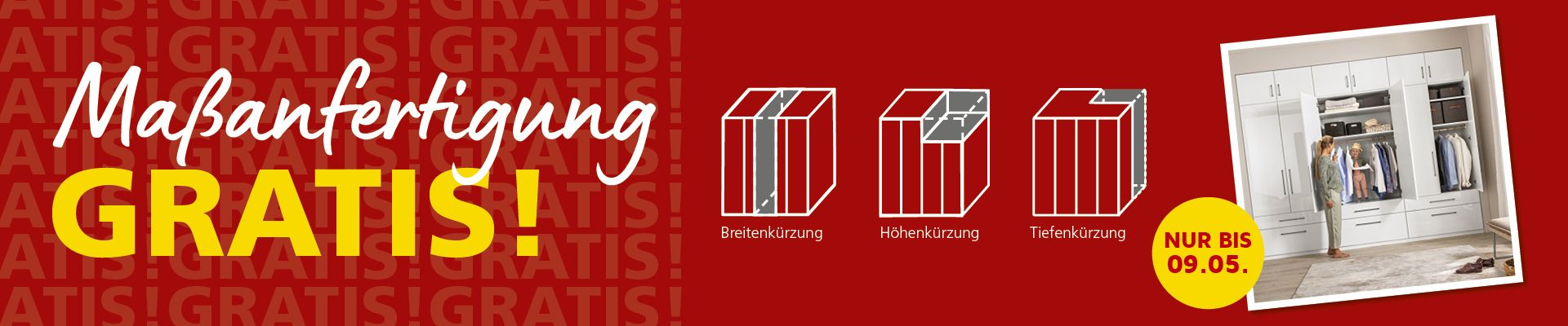 Profitieren Sie nur für kurze Zeit von unserer Sonderaktion und gestalten Sie Ihren Kleiderschrank ganz nach Ihren individuellen Raummaßen – ohne Aufpreis. Sämtliche Breiten-, Höhen- und Tiefenkürzungen sind für Sie kostenfrei.